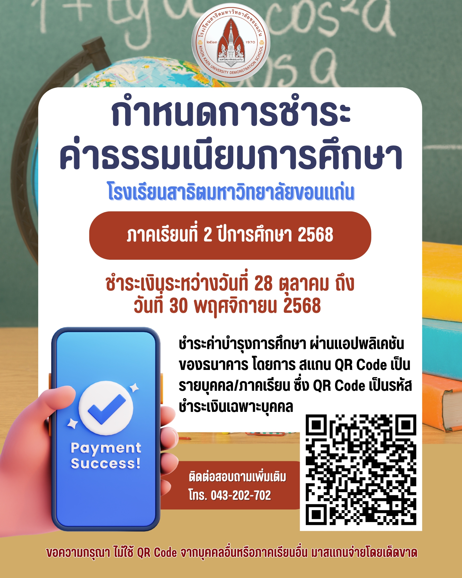 การชำระค่าธรรมเนียมการศึกษา ออนไลน์ ภาคเรียนที่ 2 ปีการศึกษา 2568 โรงเรียนสาธิตมหาวิทยาลัยขอนแก่น (มอดินแดง)