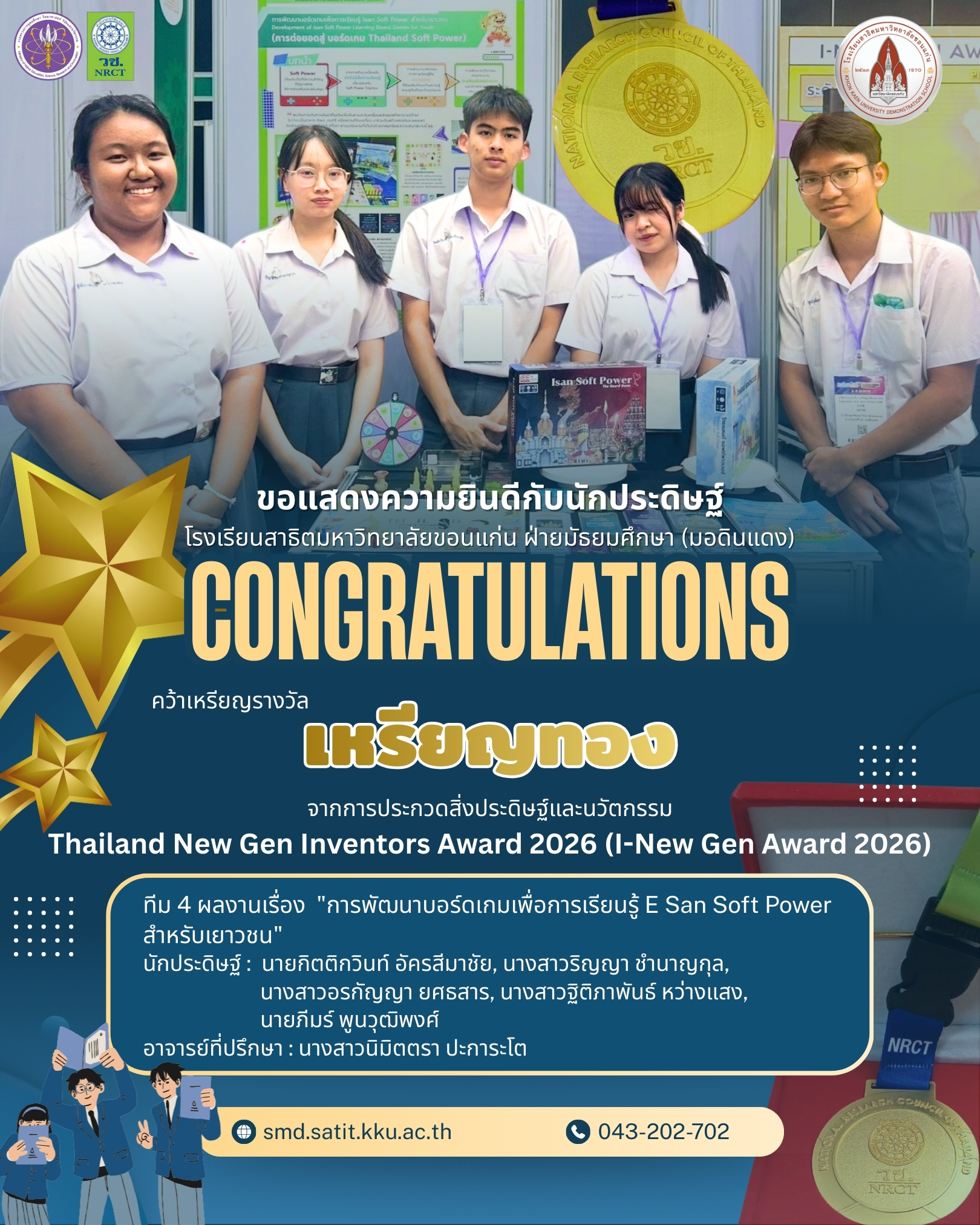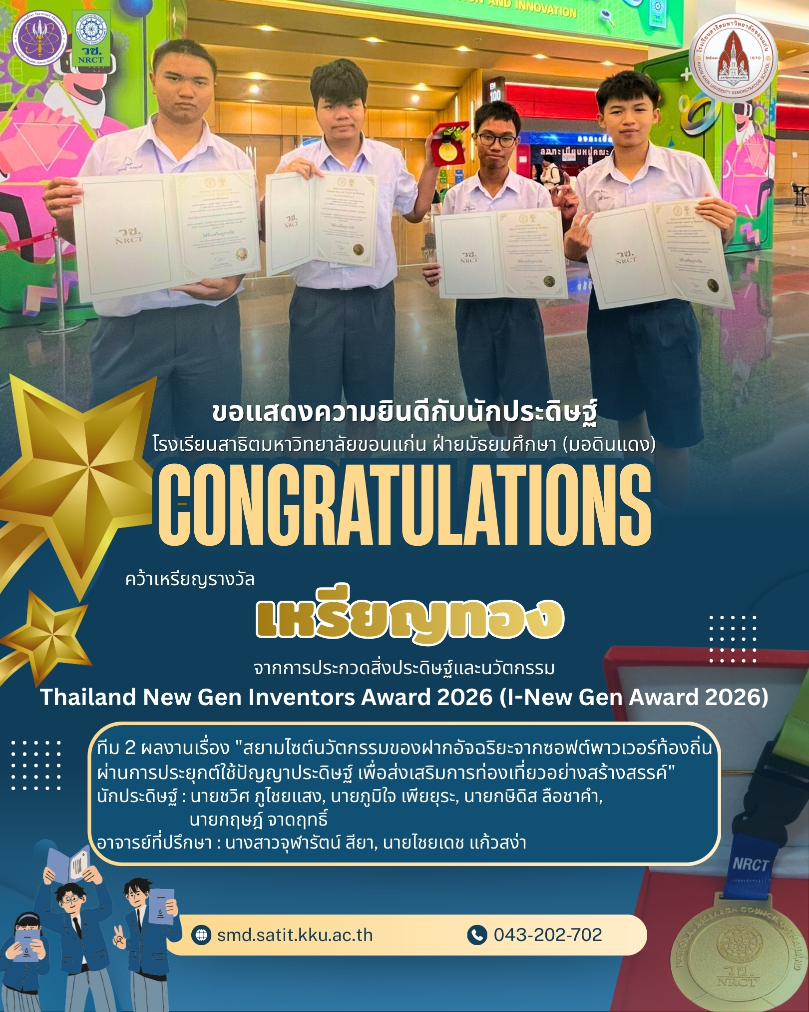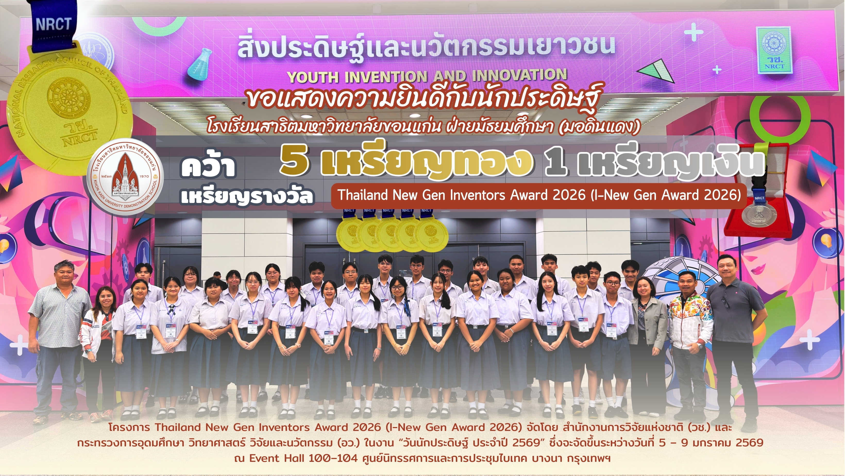 นักประดิษฐ์ โรงเรียนสาธิตมหาวิทยาลัยขอนแก่น ฝ่ายมัธยมศึกษา (มอดินแดง) คว้ารางวัล 5 เหรียญทอง และ 1 เหรียญเงิน ในรายการประกวดสิ่งประดิษฐ์และนวัตกรรม Thailand New Gen Inventors Award 2026 ระดับมัธยมศึกษา จัดโดยสำนักงานการวิจัยแห่งชาติ (วช.) กระทรวงการอุดมศึกษา วิทยาศาสตร์ วิจัยและนวัตกรรม