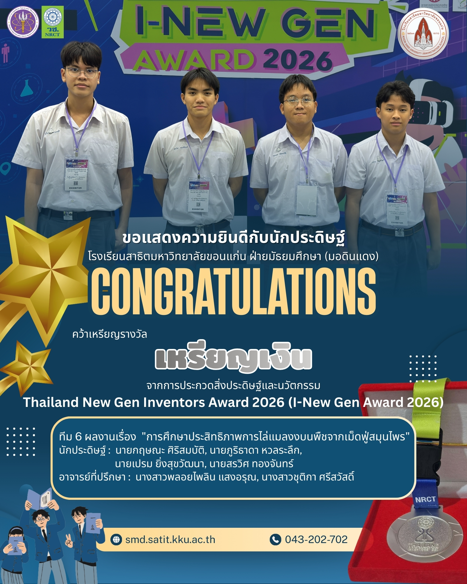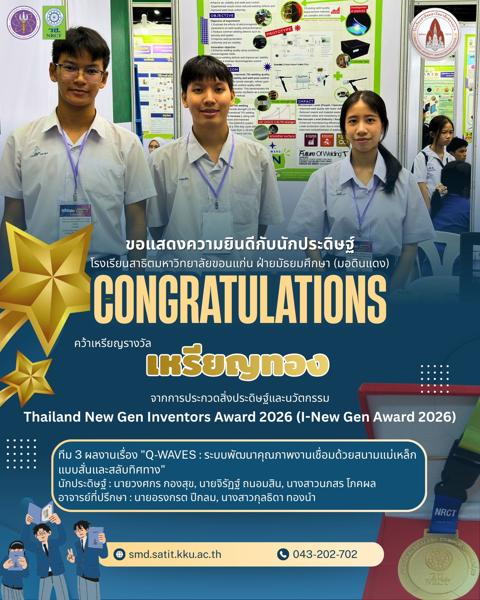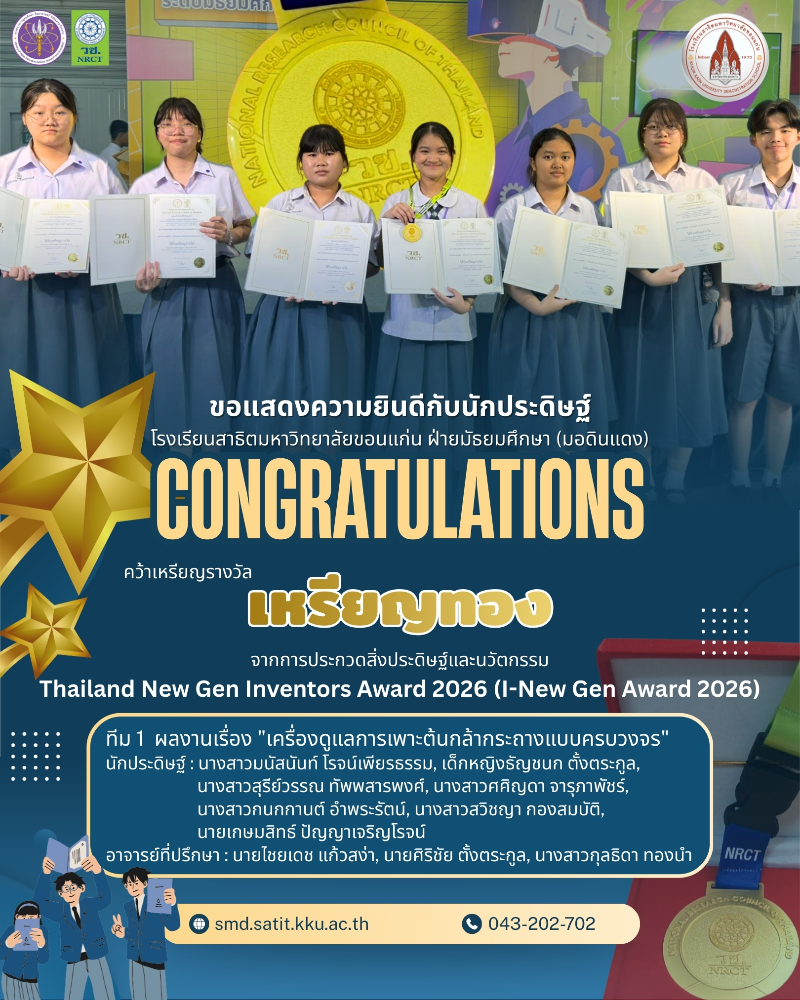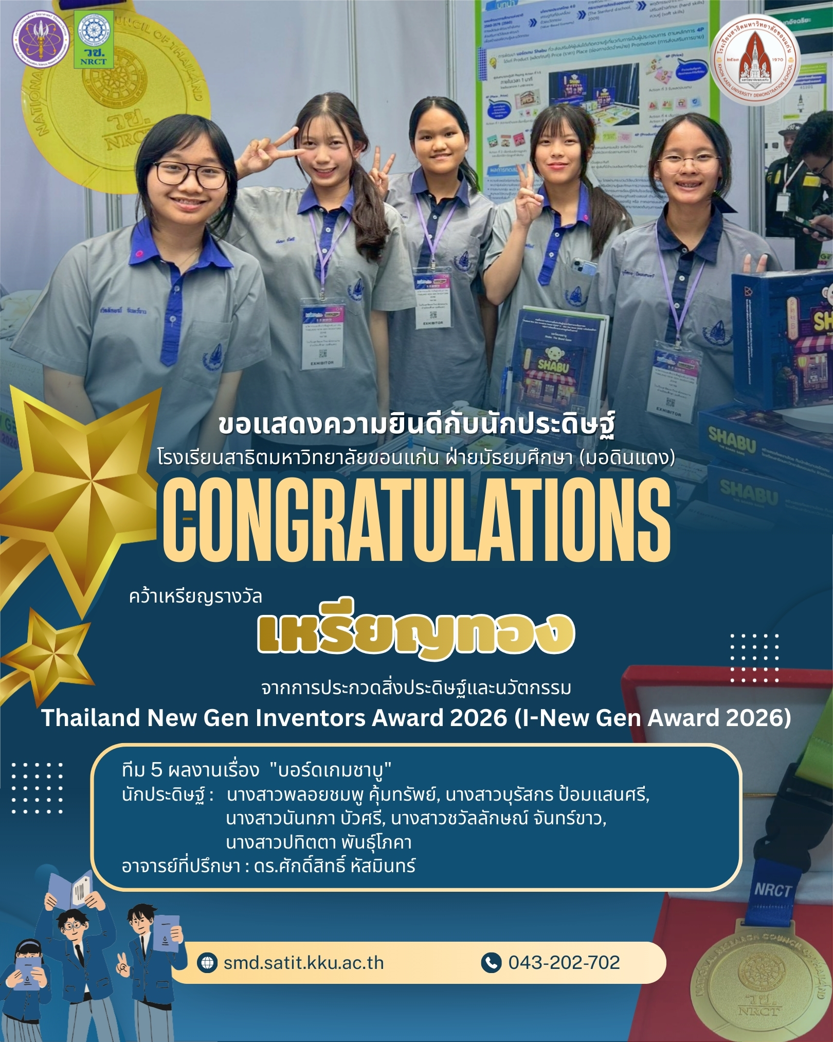 นักประดิษฐ์ โรงเรียนสาธิตมหาวิทยาลัยขอนแก่น ฝ่ายมัธยมศึกษา (มอดินแดง) คว้ารางวัล 5 เหรียญทอง และ 1 เหรียญเงิน ในรายการประกวดสิ่งประดิษฐ์และนวัตกรรม Thailand New Gen Inventors Award 2026 ระดับมัธยมศึกษา จัดโดยสำนักงานการวิจัยแห่งชาติ (วช.) กระทรวงการอุดมศึกษา วิทยาศาสตร์ วิจัยและนวัตกรรม
