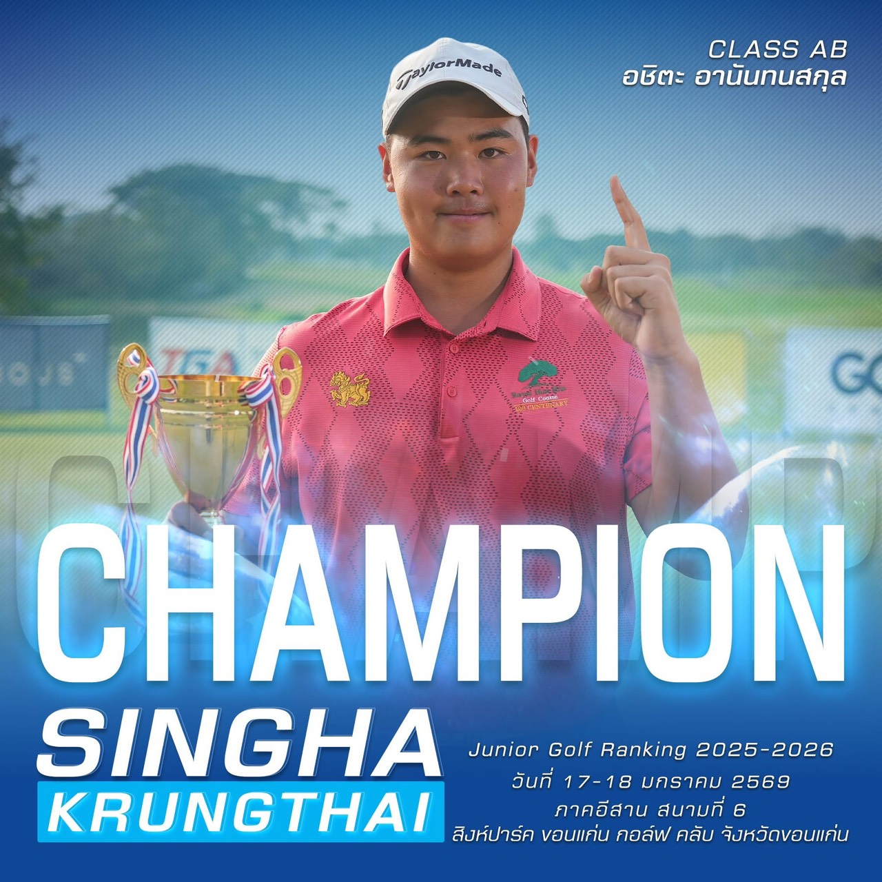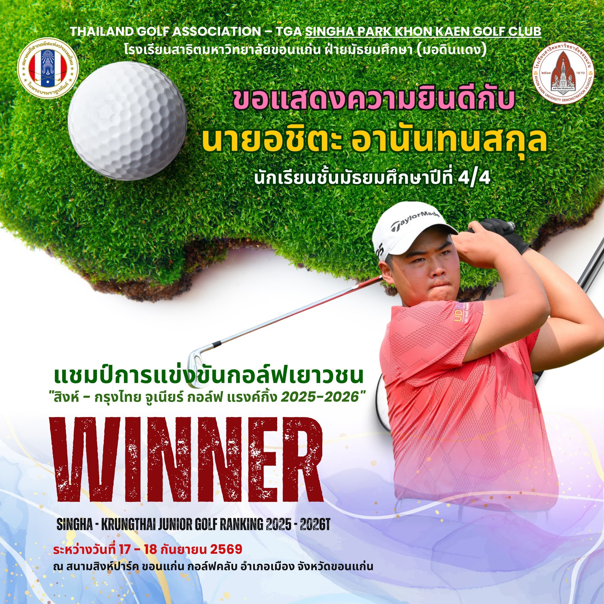 Thailand Golf Association – TGA Singha Park Khon Kaen Golf Club และโรงเรียนสาธิตมหาวิทยาลัยขอนแก่น ฝ่ายมัธยมศึกษา (มอดินแดง) ขอแสดงความยินดีกับนายอชิตะ อานันทนสกุล นักเรียนชั้นมัธยมศึกษาปีที่ 4/4 โรงเรียนสาธิตมหาวิทยาลัยขอนแก่น ฝ่ายมัธยมศึกษา (มอดินแดง) ที่คว้าแชมป์การแข่งขันกอล์ฟเยาวชน "สิงห์ - กรุงไทย จูเนียร์ กอล์ฟ แรงค์กิ้ง 2025-2026" SINGHA - KRUNGTHAI JUNIOR GOLF RANKING 2025 - 2026 ระหว่างวันที่ 17 - 18 กันยายน 2569 ณ สนามสิงห์ปาร์ค ขอนแก่น กอล์ฟคลับ อำเภอเมือง จังหวัดขอนแก่น
