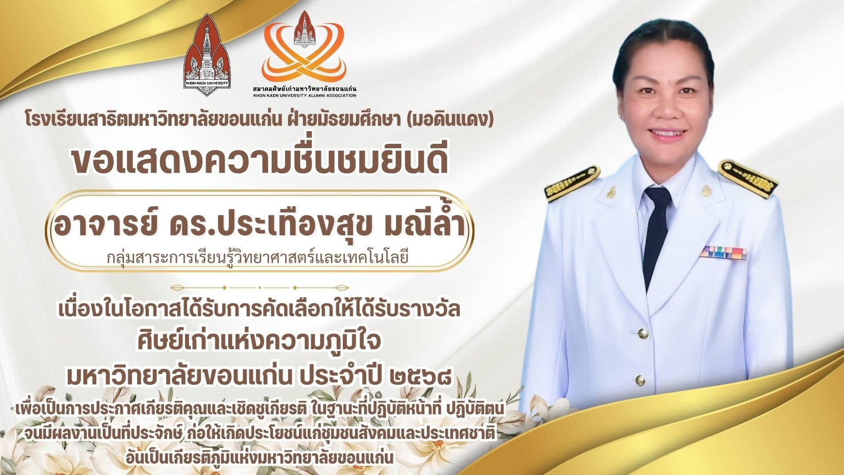 ขอแสดงความชื่นชมยินดีกับ อาจารย์ ดร.ประเทืองสุข มณีล้ำ เนื่องในโอกาสได้เข้ารับรางวัล "ศิษย์เก่าแห่งความภูมิใจ มหาวิทยาลัยขอนแก่น ประจำปี 2568"