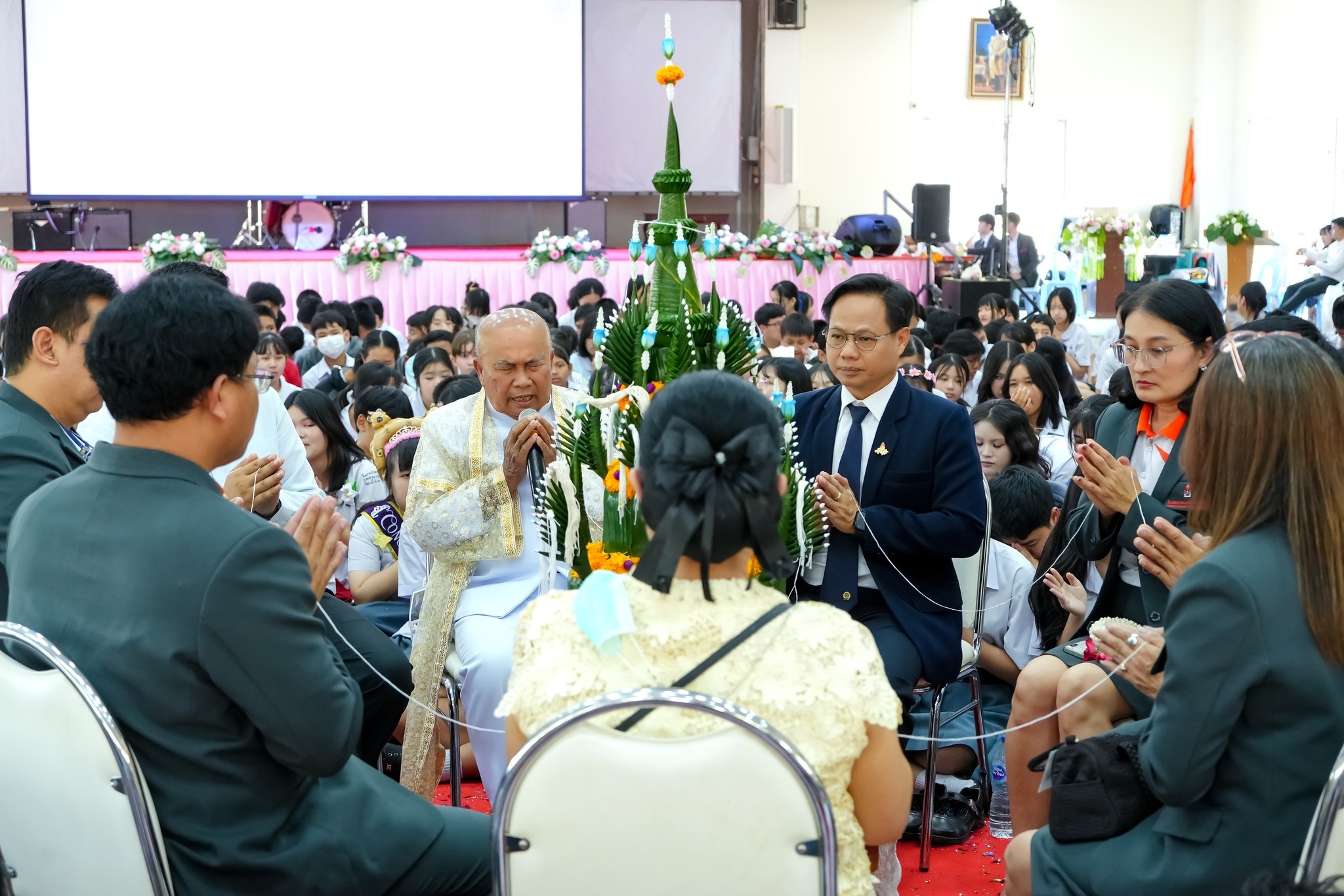 ในโอกาสนี้ ผศ.ดร.ศราวุธ จักรเป็ง รองคณบดีฝ่ายโรงเรียนสาธิตและผู้อำนวยการโรงเรียนสาธิตมหาวิทยาลัยขอนแก่น พร้อมด้วย นางนุชจรีย์ เชิดชูบัณฑิต รักษาการแทนผู้ช่วยผู้อำนวยการฝ่ายบริหารและพัฒนาบุคลากร ได้ให้เกียรติเป็นประธานในพิธีเปิดและกล่าวแสดงความยินดีแก่ผู้สำเร็จการศึกษา ภายในงานมีการจัดฉายวิดีทัศน์ “น้องยินดี พี่สำเร็จ” และ “ด้วยรักและผูกพัน” พร้อมทั้งการกล่าวแสดงความรู้สึกจากตัวแทนนักเรียนทั้งสองระดับชั้น นอกจากนี้ ยังมีพิธีขอขมาอาจารย์ เพื่อแสดงความกตัญญูกตเวที และพิธีบายศรีสู่ขวัญ ซึ่งเป็นพิธีการที่เปี่ยมด้วยความหมายตามขนบธรรมเนียมอันดี โดยมีการแสดงชุด “รำบายศรีสู่ขวัญ” ก่อนเข้าสู่ช่วงพิธีผูกข้อมือรับขวัญจากคณะผู้บริหารและคณาจารย์ เพื่อเป็นสิริมงคลและเป็นการอวยพรให้ศิษย์ประสบความสำเร็จในก้าวต่อไปของชีวิต ปิดท้ายด้วยการแสดงดนตรีสร้างความสนุกสนานและรอยยิ้มให้กับทุกคนในงาน