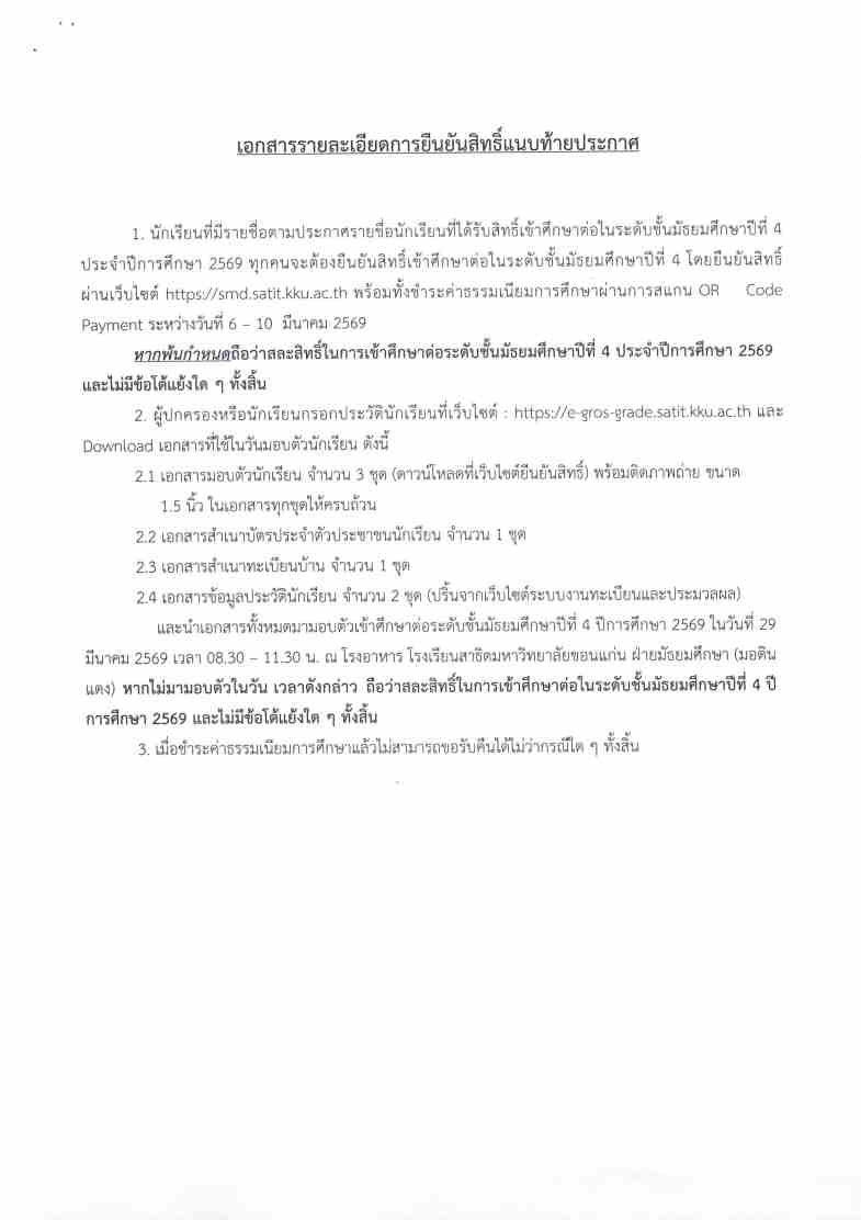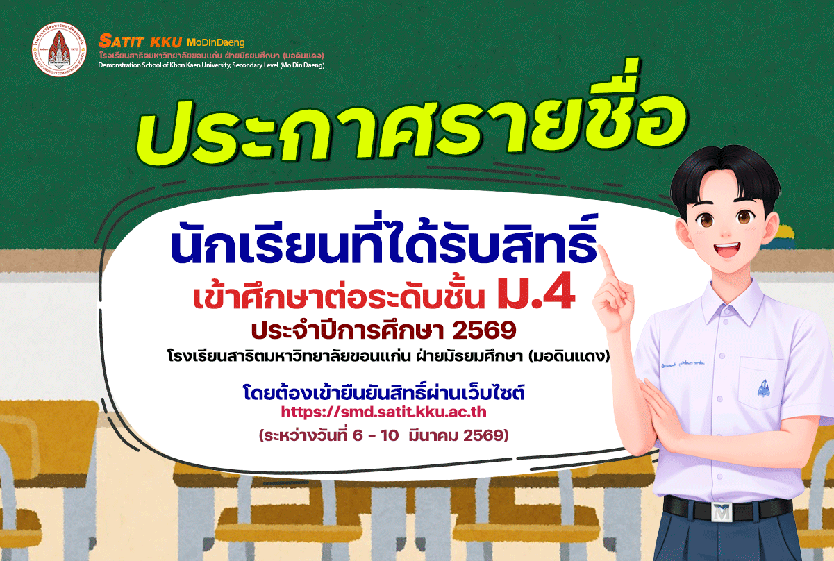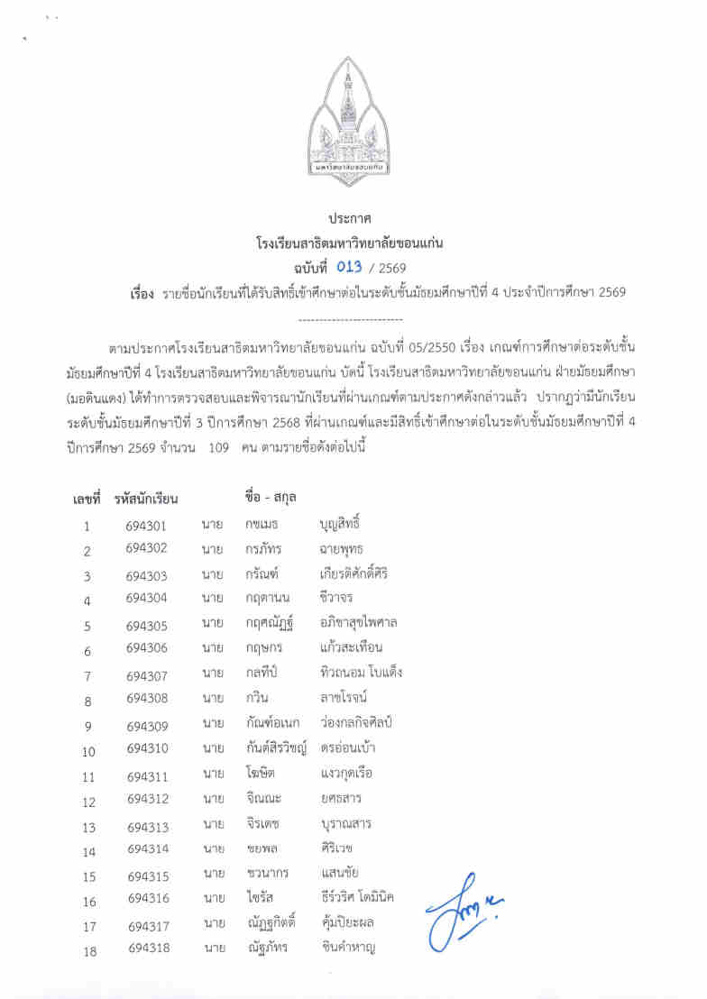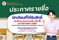 ประกาศรายชื่อนักเรียนที่ได้รับสิทธิ์เข้าศึกษาต่อในระดับชั้นมัธยมศึกษาปีที่ 4 ประจำปีการศึกษา 2569
